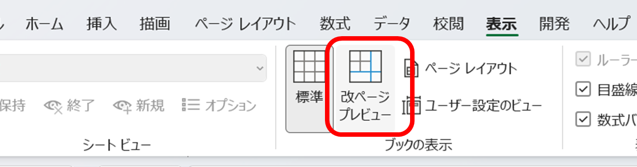 または、リボンの「表示」タブをクリックし、「ブックの表示」グループ内の「改ページプレビュー」をクリックする