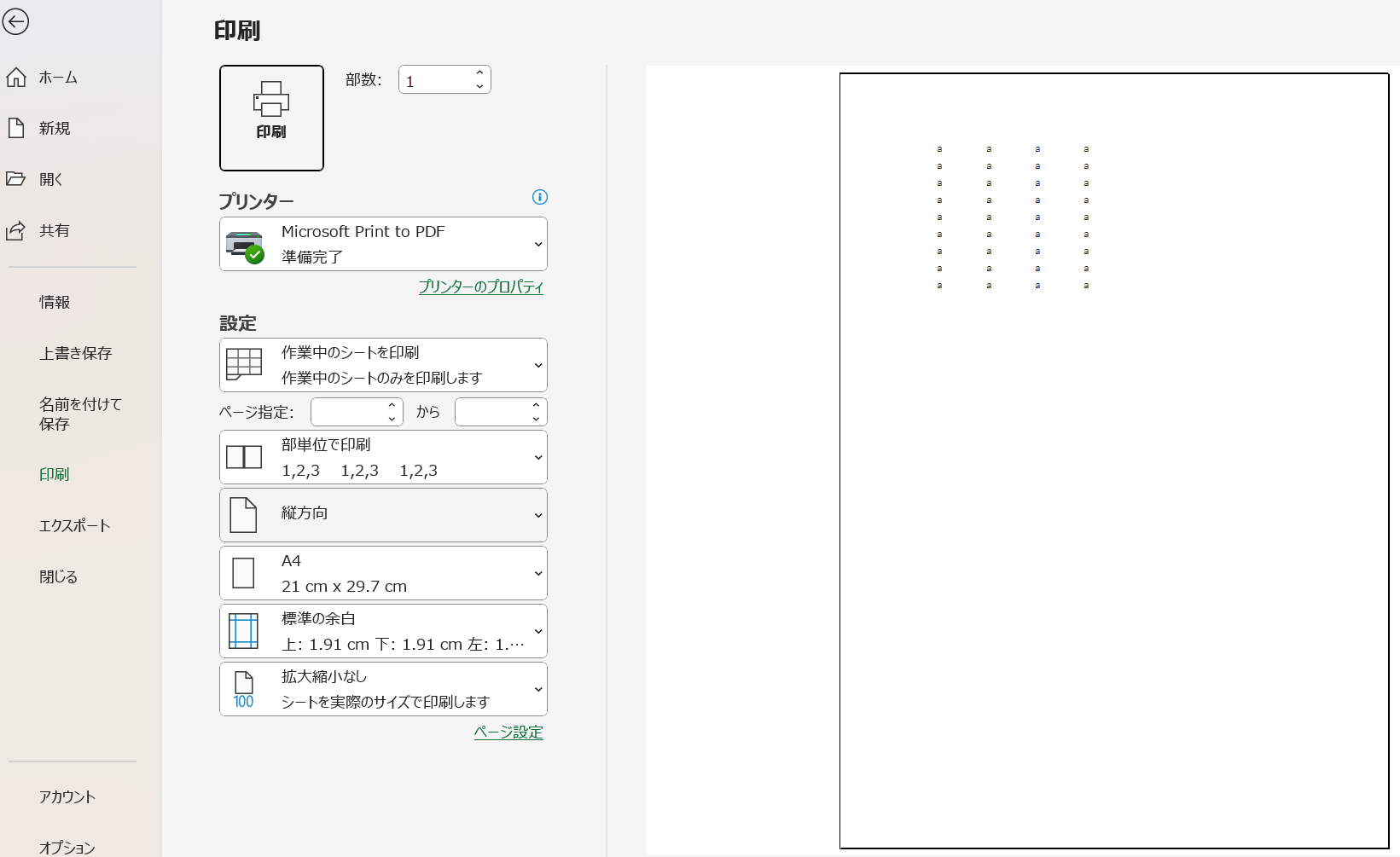 Ctrl+Pキーを押すか、「ファイル」タブから「印刷」を選択します。印刷プレビュー画面が表示され、現在のページ設定に基づいた印刷イメージが確認できます。この画面で何ページに分かれるか、どこで改ページされるかを確認します。