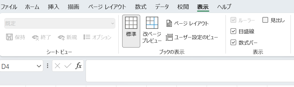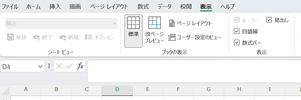 | 行番号・列ヘッダーが両方消えた | 「表示」タブの「見出し」がオフになっている | 「表示」タブ→「見出し」にチェックを入れる |