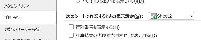 ③または「ファイル」→「オプション」→「詳細設定」→「このシートの表示設定」で設定を確認する