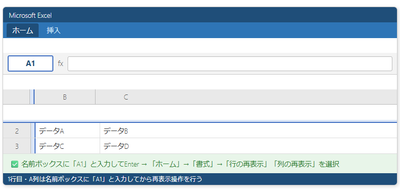 この場合は、数式バー左の「名前ボックス」に「A1」と直接入力してEnterキーを押します。これにより、非表示の1行目・A列を含むセルA1が選択された状態になります。