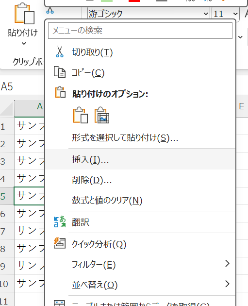 例えば、5行目に新しい行を追加したい場合、行番号の「5」をクリックして行全体を選択し、右クリックして「挿入」を選択します。