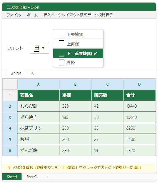 | 下二重罫線 | 各セルの下辺に二重線 | 合計・小計の区切り |