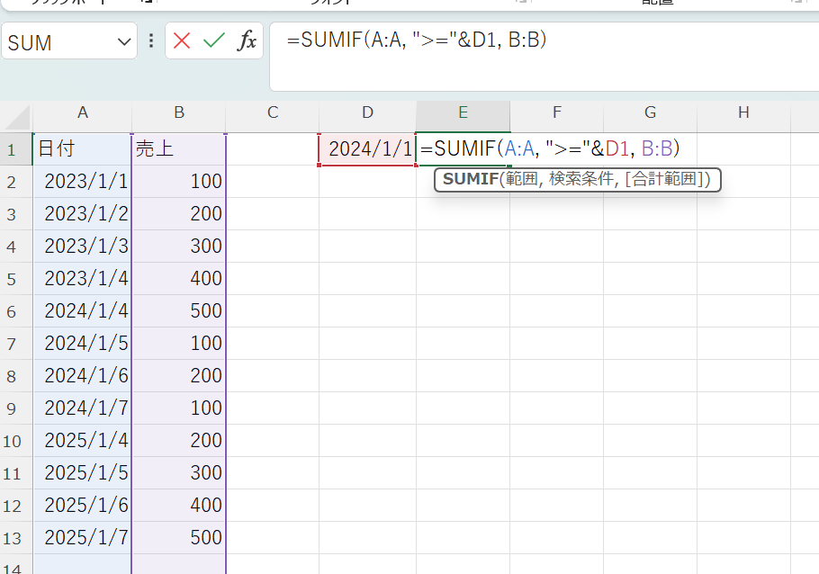 D1セルに開始日を入力しておけば、D1の日付を変更するだけで集計対象の期間が自動で切り替わります。比較演算子はダブルクォーテーションで囲み、セル参照と「&」でつなぐのが正しい書き方です。演算子までセル参照に含めてしまうと正しく動作しないため注意しましょう。