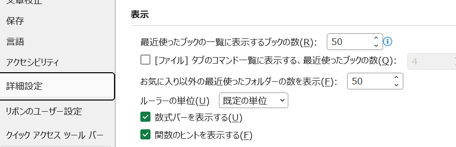 Excelのオプションにも数式バーの表示設定が存在します。「表示」タブで変更しても直らない場合はオプションの詳細設定を必ず確認してみましょう。