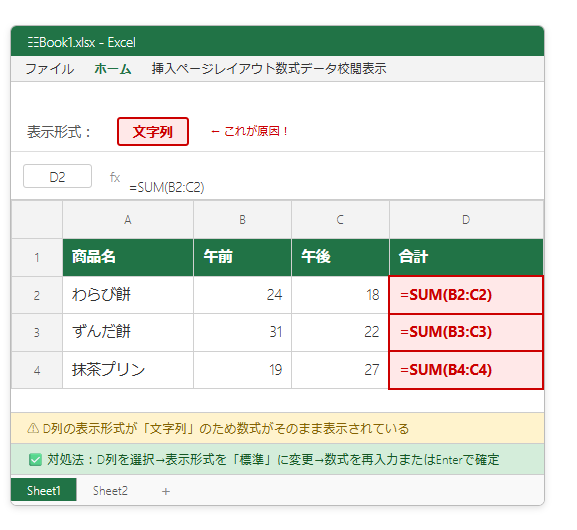 ⚠ 数式バーに ‘=SUM(B2:C2) のようにアポストロフィが先頭にある(セルには表示されない)