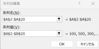 4. 「X軸の系列値」にX軸に使うデータ範囲を入力する(例:$A$2:$A$20)