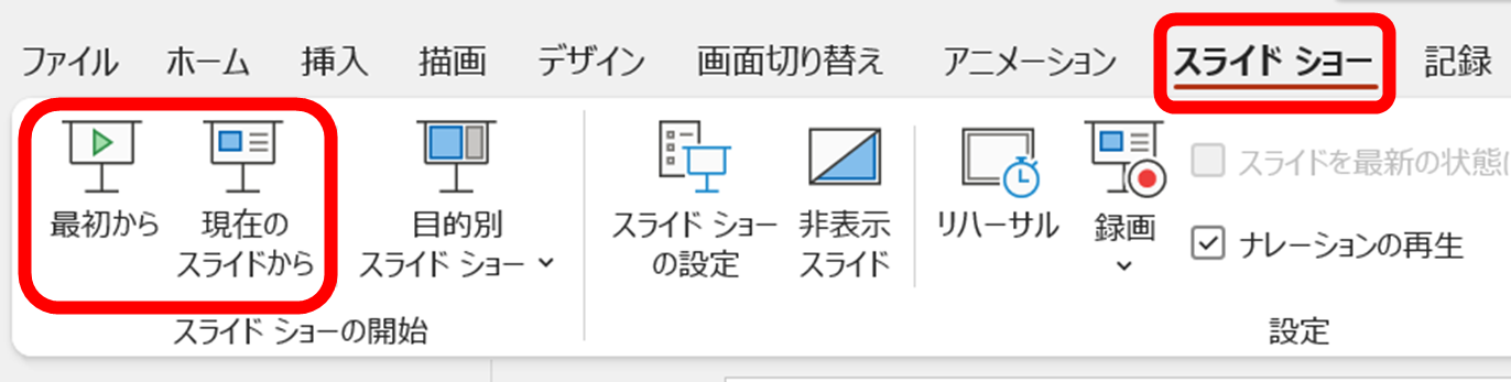 ショートカットキーを使わずにスライドショーを開始したい場合は、「スライドショー」タブから操作できます。