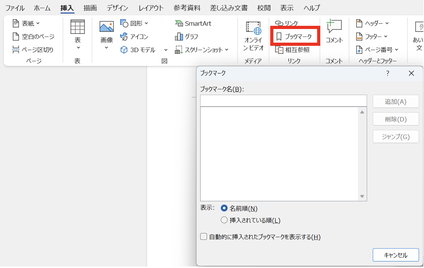 ブックマークの確認 挿入タブ→ブックマーク→一覧表示
