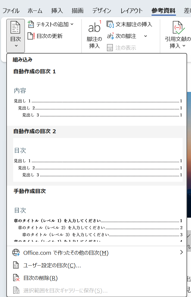「参考資料」タブの「目次」をクリックし、「自動作成の目次1」または「自動作成の目次2」を選択します。すると、文書内の見出しが自動的に収集されて目次が生成され、各目次項目に文書内リンクが自動で設定されます。Ctrl+クリックで各目次項目から対応する見出し位置にジャンプできることを確認しましょう。