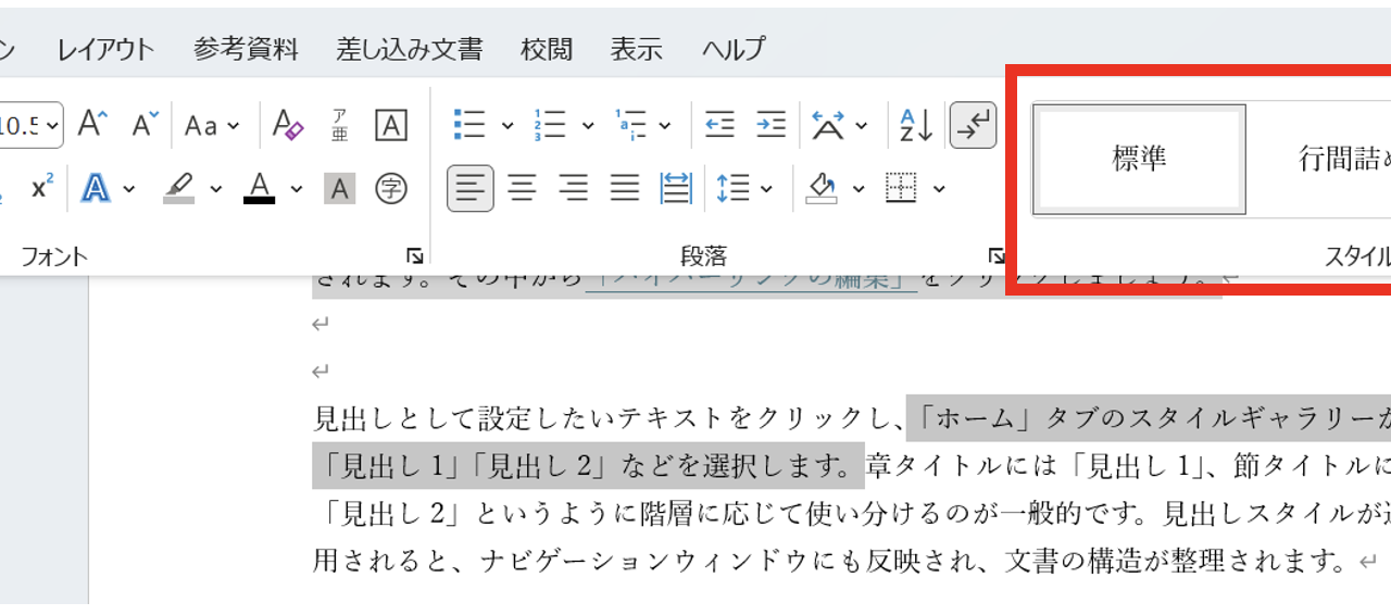 見出しとして設定したいテキストをクリックし、「ホーム」タブのスタイルギャラリーから「見出し1」「見出し2」などを選択します。章タイトルには「見出し1」、節タイトルには「見出し2」というように階層に応じて使い分けるのが一般的です。見出しスタイルが適用されると、ナビゲーションウィンドウにも反映され、文書の構造が整理されます。
