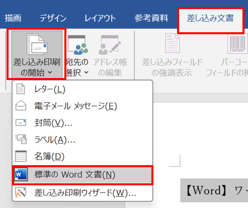 手順3:「差し込み印刷の開始」グループにある「差し込み印刷の開始」をクリックする