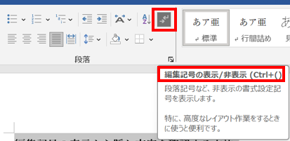手順2:段落グループにある「編集記号の表示/非表示」ボタン(¶マーク)をクリックする