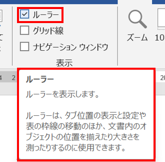 手順2:「表示」グループにある「ルーラー」のチェックボックスを確認する