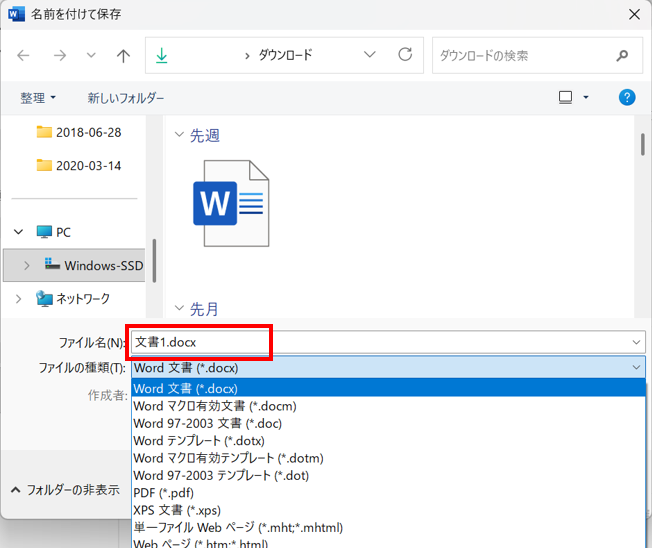 手順4:ファイルの種類から「Word文書(*.docx)」を選択する