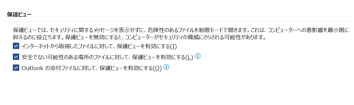 保護ビューの設定には「インターネットから取得したファイル」「安全でない場所のファイル」「Outlookの添付ファイル」など複数の項目があります。必要最小限の変更にとどめることがセキュリティ上の観点から重要です。