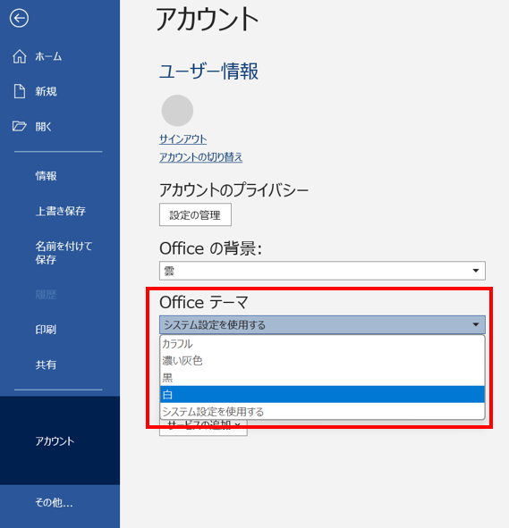 | システム連動を解除する | ファイル→アカウント→Officeテーマ→「白」または「カラフル」 | Windowsの設定に関わらずOfficeのみ明るくなる |